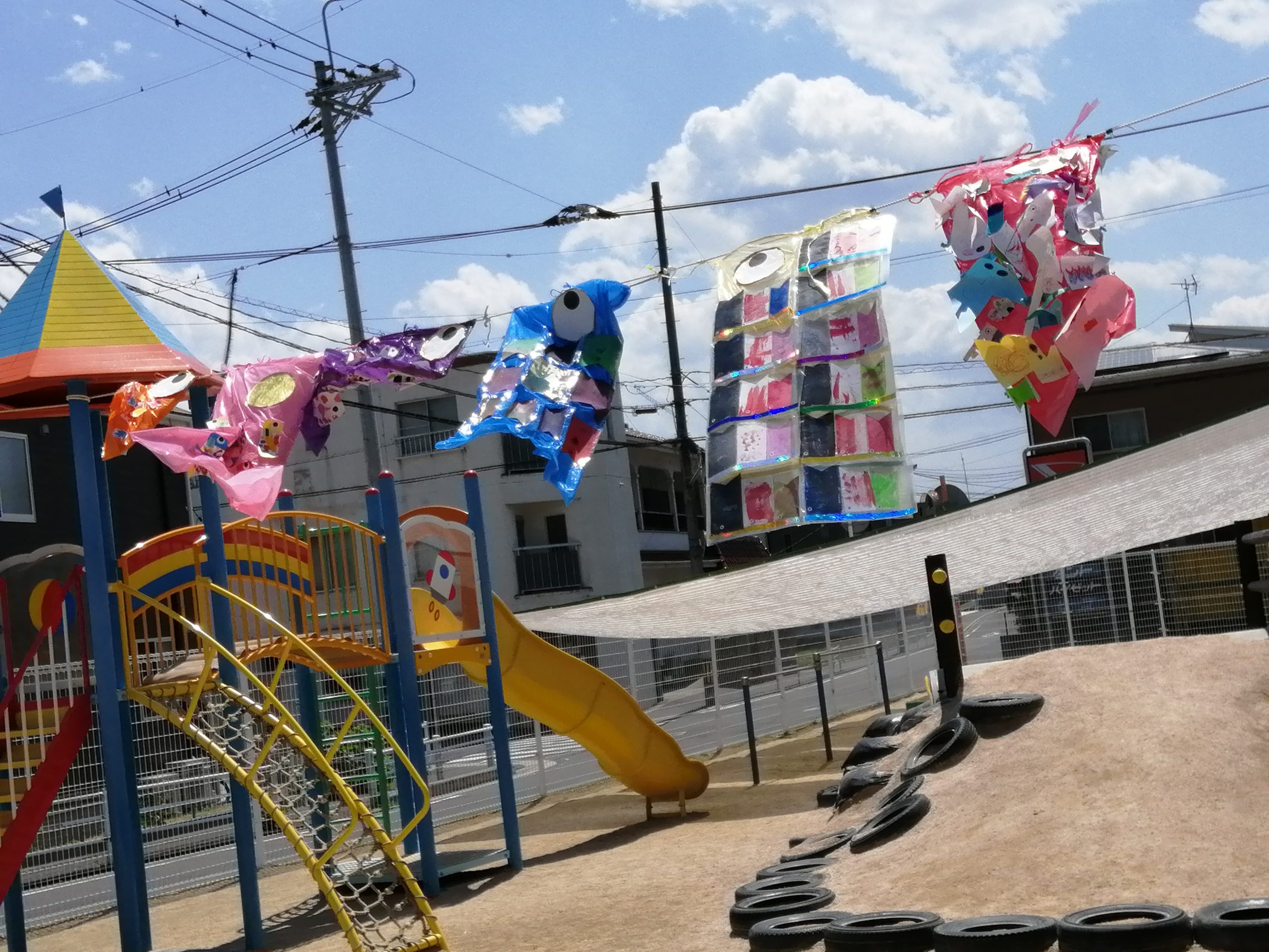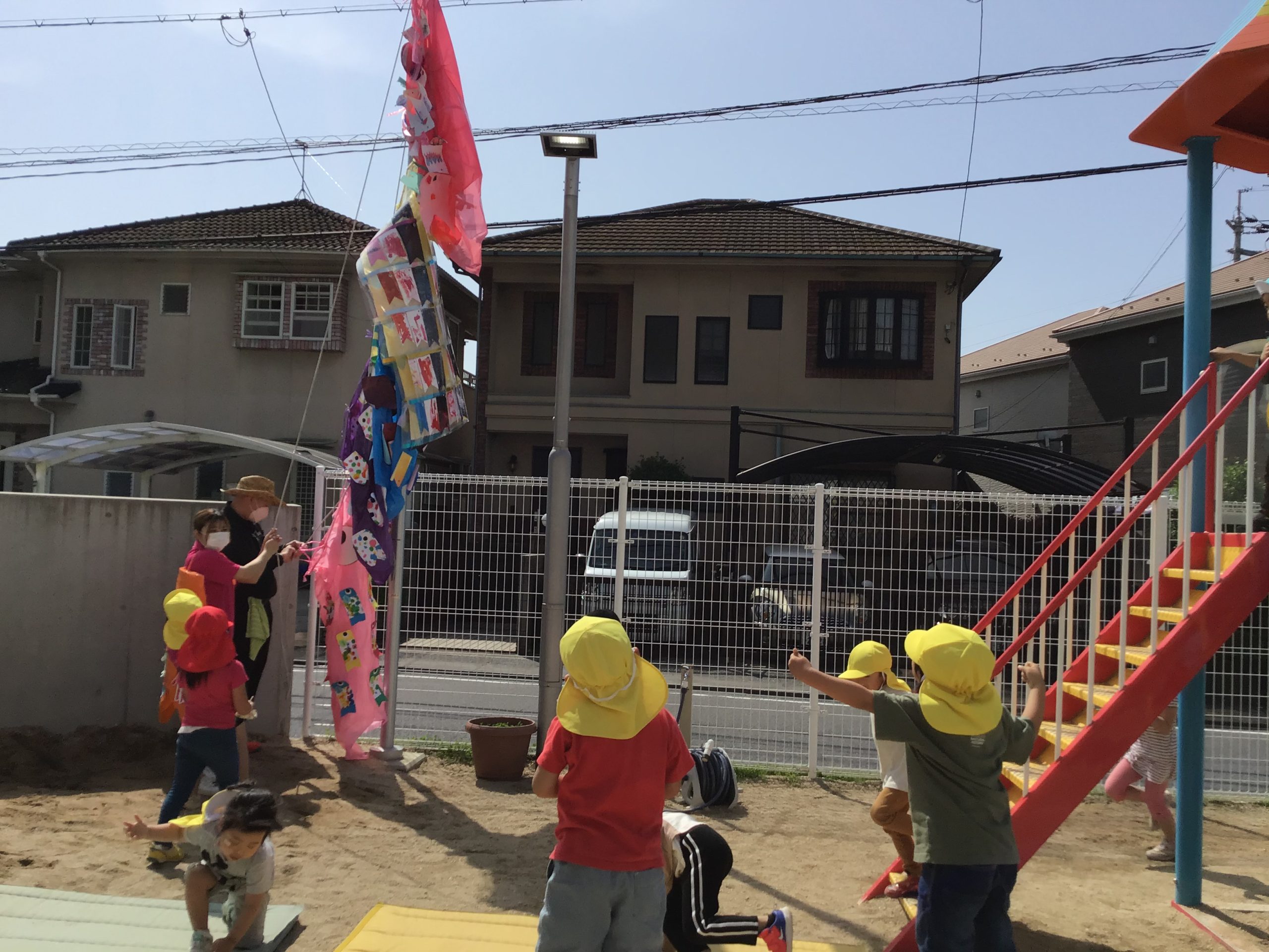 5月2日に少し飾り方を変えて再チャレンジしました。するとRainbow classのこいのぼりの目が園庭の門まで飛んでいくくらい元気いっぱいに泳いでくれました🎵