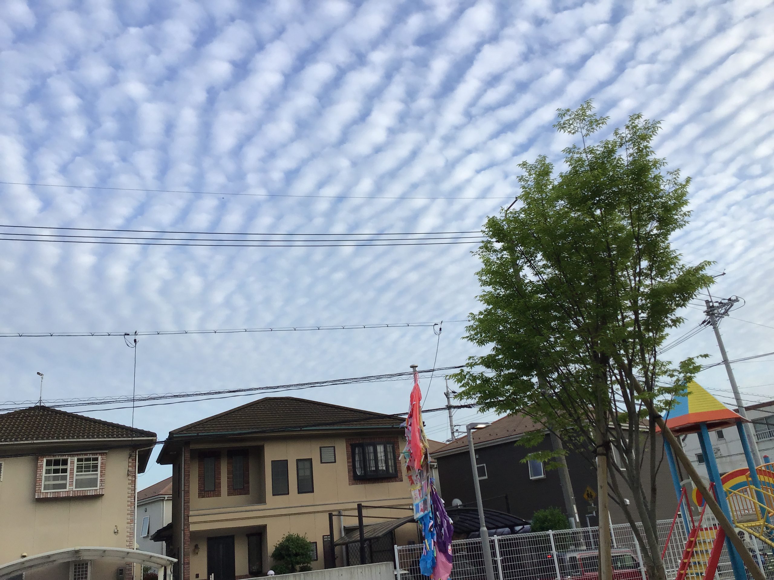 子どもたちが作ったこいのぼりが「Grow up! Grow up!」の掛け声で空にあがりました。 今日は風が弱く元気に泳ぐまではいかなかったものの、子どもたちは自分のクラスのこいのぼりを見て指を指していましたよ。 夕方空を見上げるとこいのぼりのウロコのような雲! 1.2歳児の子どもたちは「わぁ」と目を輝かせていました。